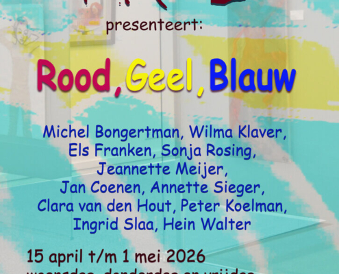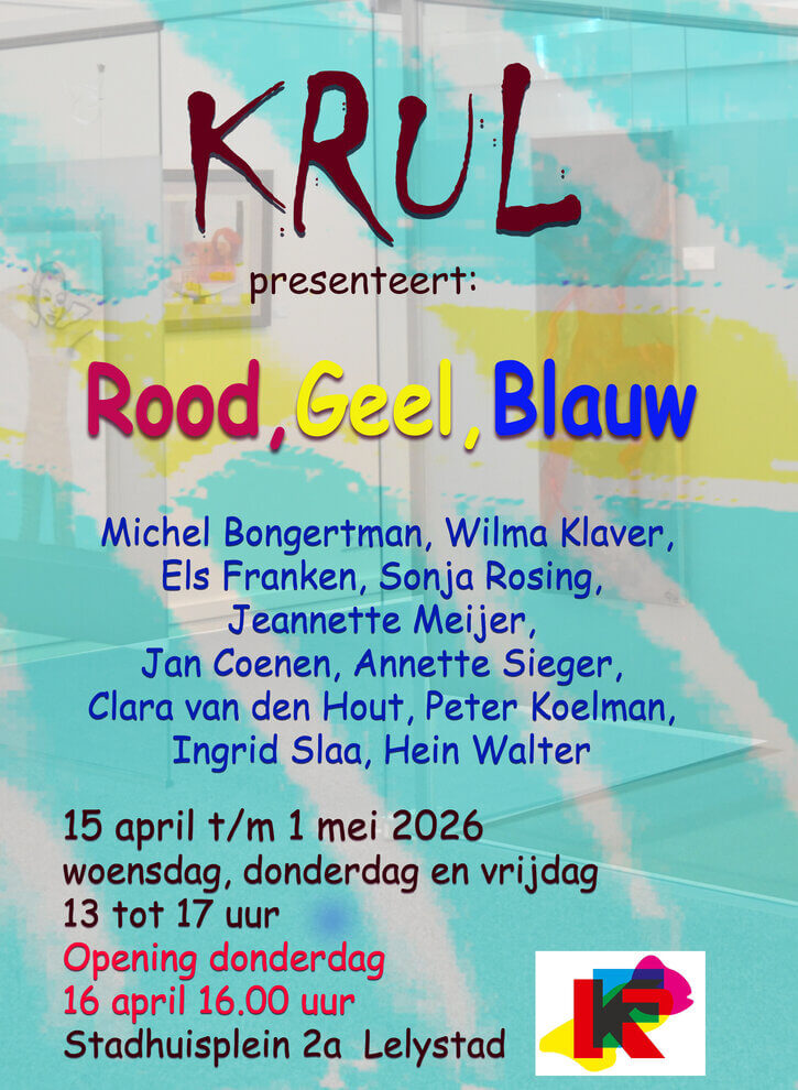 11 Künstler von Kunstenaars Flevoland stellen ihre roten, gelben und blauen Werke im KRUL aus. KRUL ist der Ausstellungsraum im Rathaus von Lelystad.